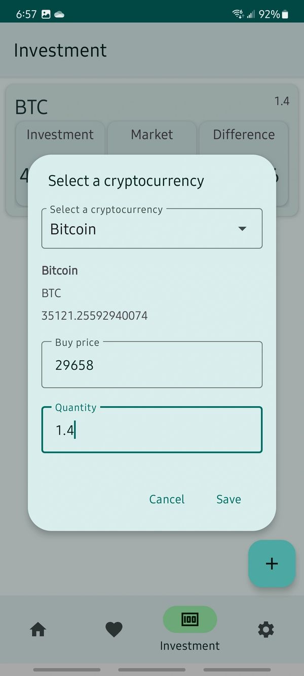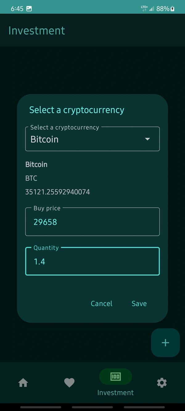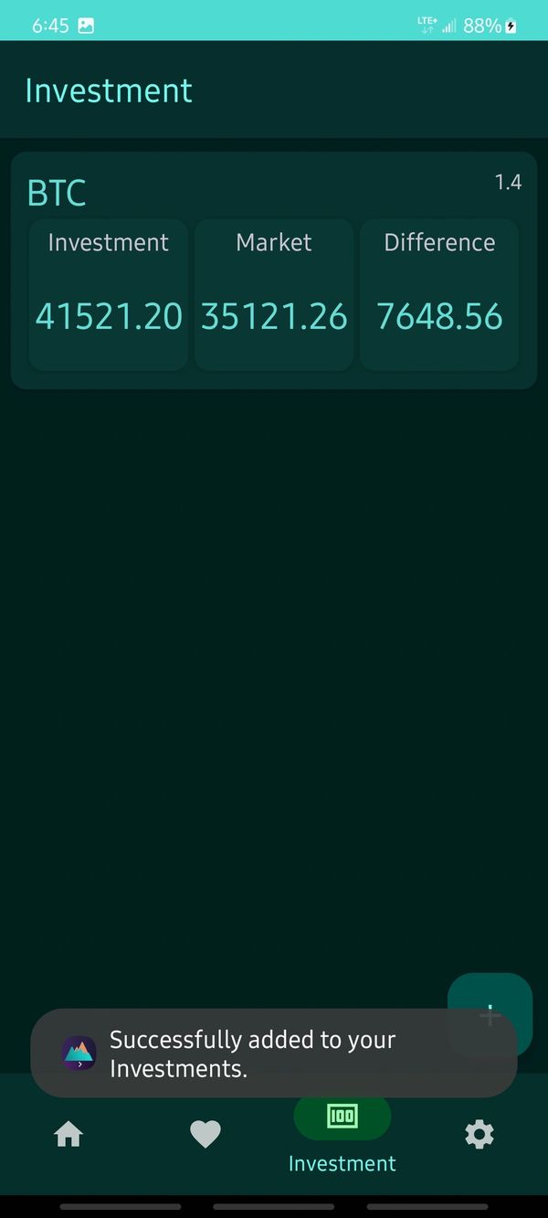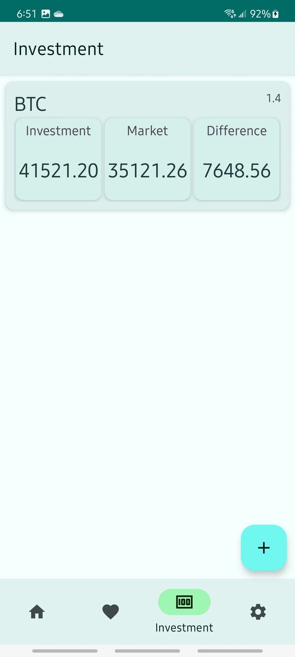 When the user clicks on the floating action button, the action performed will vary depending on the screen they are currently on. If they are on the coin details screen, it will enable them to add the coin to their favorites. However, if they are on the investment screen, it will provide the option to add a new investment. This dynamic functionality enhances the user experience and streamlines their interaction with the app.