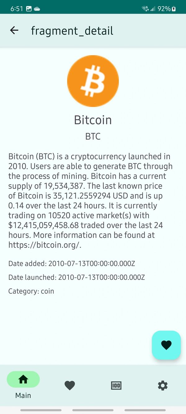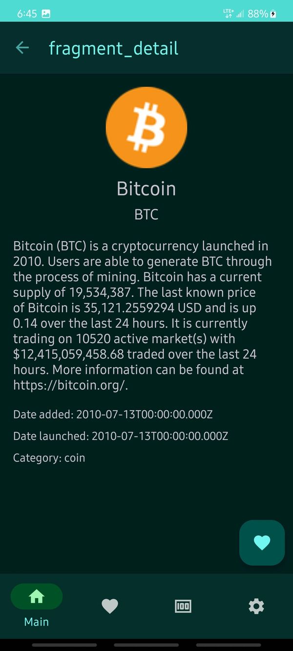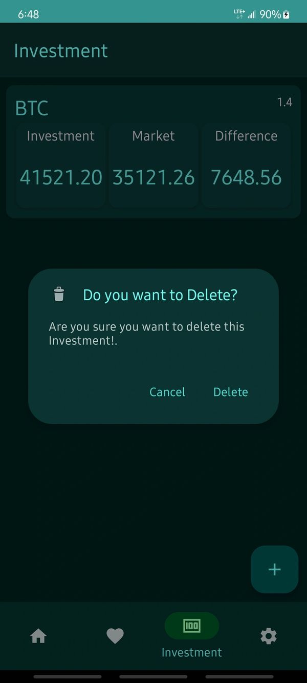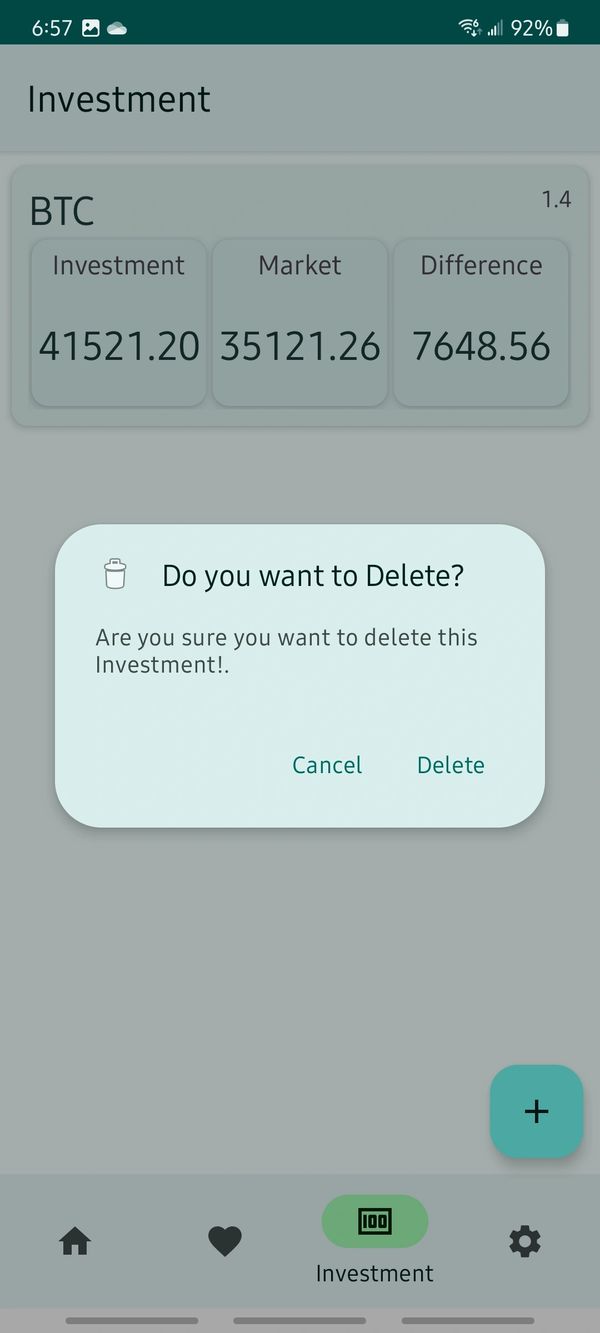 When the user clicks on the floating action button, the action performed will vary depending on the screen they are currently on. If they are on the coin details screen, it will enable them to add the coin to their favorites. However, if they are on the investment screen, it will provide the option to add a new investment. This dynamic functionality enhances the user experience and streamlines their interaction with the app.