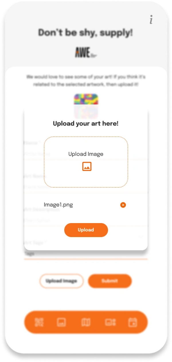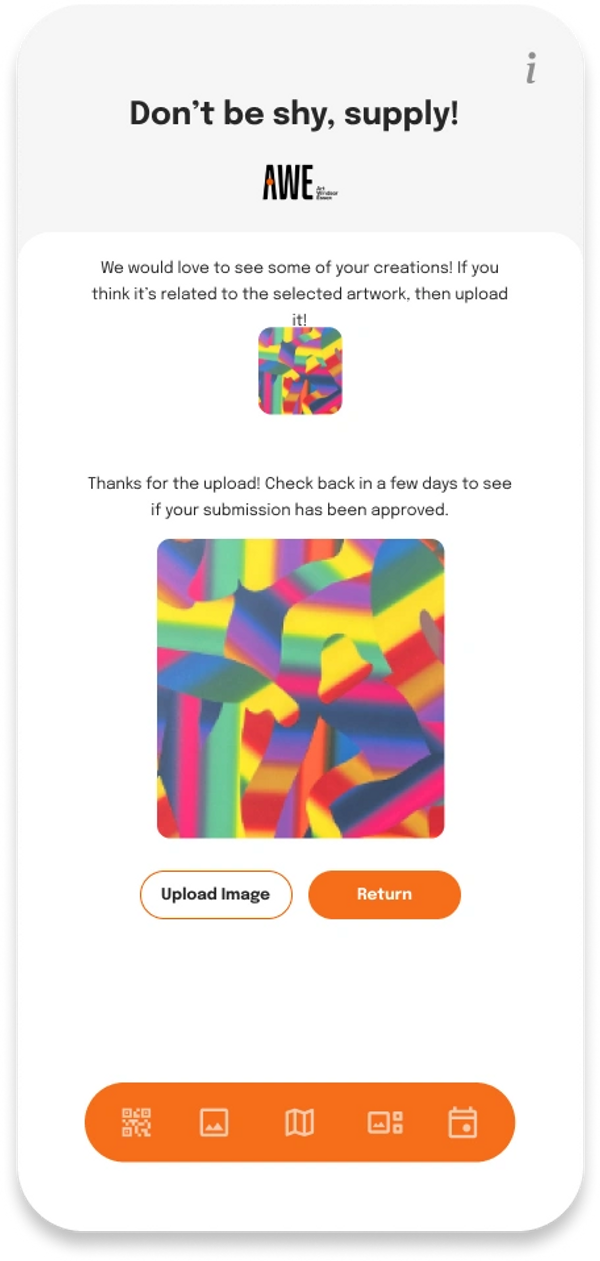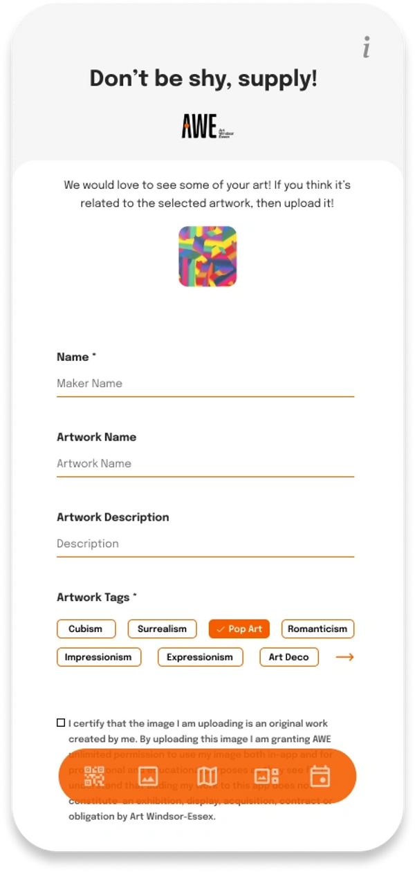 The AWE app’s usability features focus on providing a seamless, user-friendly experience through intuitive navigation, easy account management, and quick QR code scanning for artwork details. It includes an interactive map for locating art, real-time notifications for events, and allows user to attach their art to a piece of physical art.